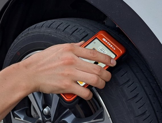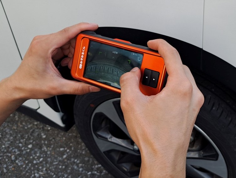タイヤに沿って「AIみぞみるくん」を当てています。(この時タイヤにレーザーを当てて溝の深さを測定しています。)