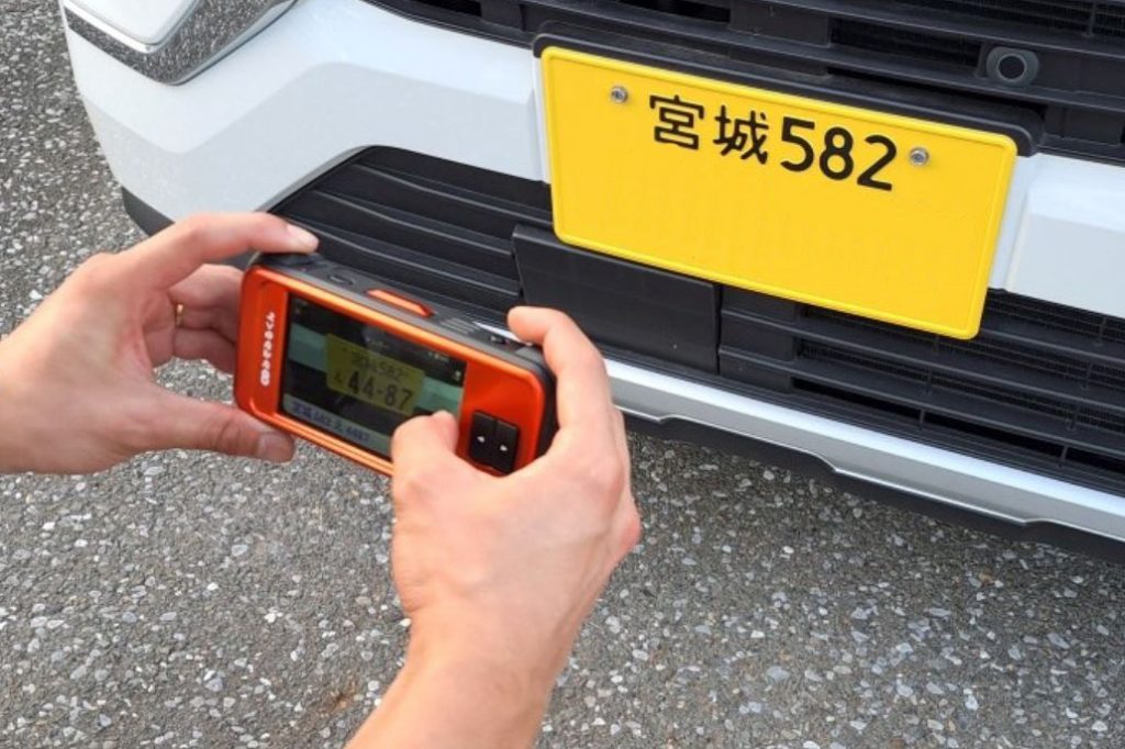 まずは、車のナンバーを撮影します。(手に持っているのが「AIみぞみるくん」です。)