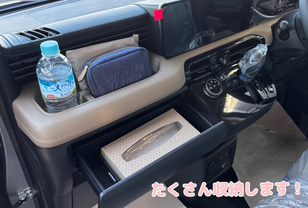 今回の新型デリカミニから登場した助手席側のトレイは広く、ポーチが2つ入る程の広さです!